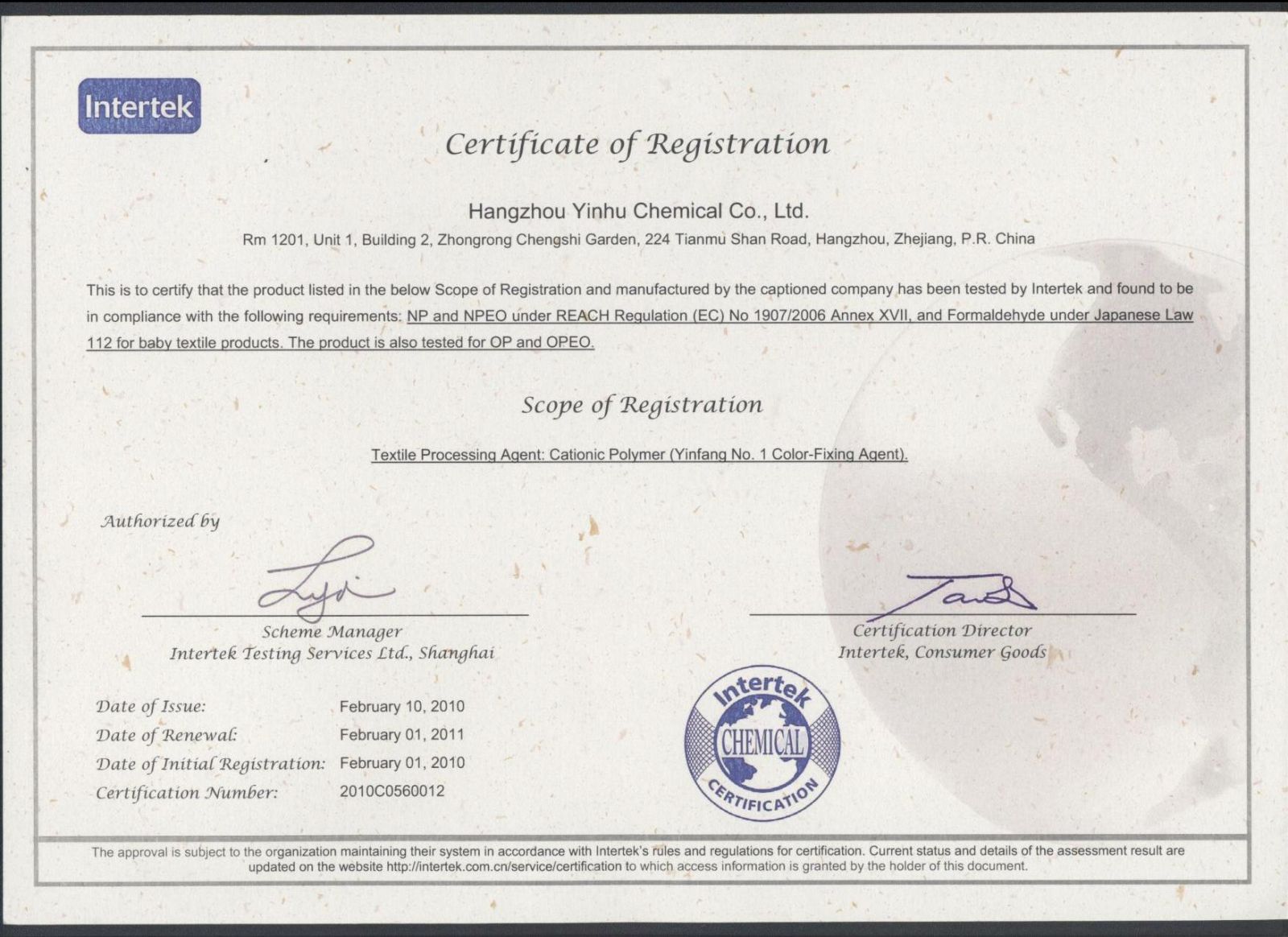 Intertek certificate of Yinfang No.1